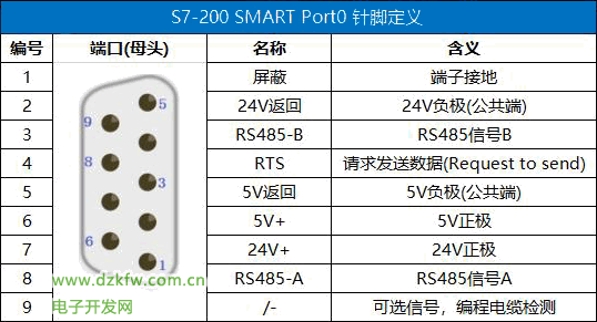 本例程使用CPU ST20本体集成的串口(编号:Port0)连接温湿度传感器。Port0针脚定义如下表所示: