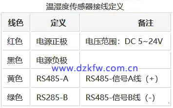该温湿度传感器有四条线,颜色分别是:红、黑、黄、绿,各线的定义如下: