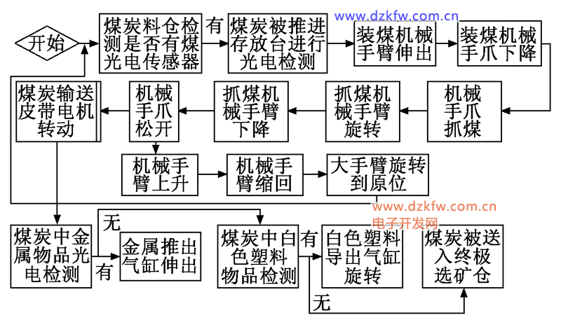 随着制造业自动化程度的不断发展,煤炭的输送过程控制也逐渐实现了自动化。为了减少因多机械造成的井下安全隐患,提高矿井中的作业效率,就需要将煤炭的挖掘、输送及分拣有机地结合起来。通过分析与考察,本文提出一种新型的煤炭输送机的控制系统设计方案,此装置包括装煤机械手、煤炭带式传输装置及触摸显示装置等。利用西门子S7-200 PLC编程软件,结合气动装置、光电传感器、变频器、步进电机等实现了装煤机械手的驱动,进而实现了煤炭的准确有效传输,并可以根据工位的需要调节传感器及限位开关的位置。
