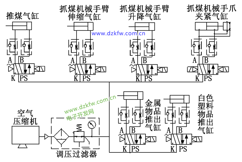 气动控制是既经济又安全可靠的一种控制方式,在煤炭输送控制系统中,煤炭的推出、抓煤机械手臂伸缩和升降、手爪的夹紧及煤炭中金属及塑料物品的推出等动作都利用气缸来实现,通过6个电磁换向阀对6个气缸进行控制。煤炭输送机的气动控制原理如图2所示。