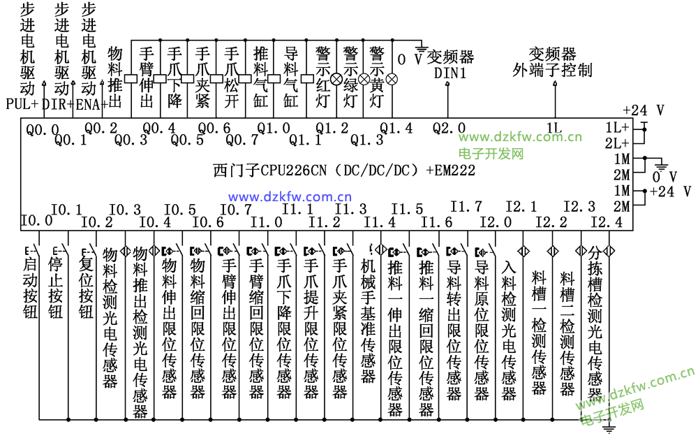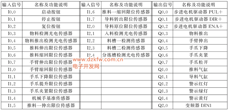 输入信号名称及功能说明输入信号名称及功能说明输出信号名称及功能说明I0.0启动按钮I1.6推料一缩回限位传感器Q0.0步进电机驱动器PUL+I0.1停止按钮I1.7导料转出限位传感器Q0.1步进电机驱动器DIR+I0.2复位按钮I2.0导料原位限位传感器Q0.2步进电机驱动器ENA+I0.3物料检测光电传感器I2.1入料检测光电传感器Q0.3物料推出I0.4物料推出检测光电传感器I2.2料槽一检测传感器Q0.4手臂伸出I0.5推料伸出限位传感器I2.3料槽二检测传感器Q0.5手爪下降I0.6推料缩回限位传感器I2.4分拣槽检测光电传感器Q0.6手爪夹紧I0.7手臂伸出限位传感器Q0.7手爪松开I1.0手臂缩回限位传感器Q1.0推料气缸I1.1手爪下降限位传感器Q1.1导料气缸I1.2手爪提升限位传感器Q1.2警示红灯I1.3手爪夹紧限位传感器Q1.3警示绿灯I1.4机械手基准传感器Q1.4警示黄灯I1.5推料一伸出限位传感器Q2.0变频器DIN1
