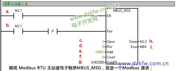 2. 调用 Modbus RTU 主站读写子程序MBUS_MSG,发送一个Modbus 请求;