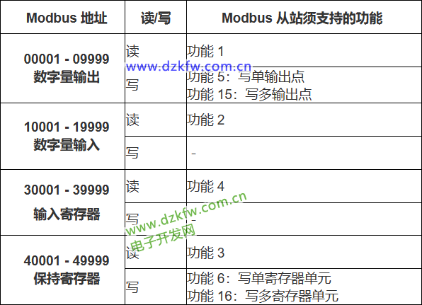 通常 Modbus 地址由 5 位数字组成,包括起始的数据类型代号,以及后面的偏移地址。Modbus Master 协议库把标准的 Modbus 地址映射为所谓 Modbus 功能号,读写从站的数据。Modbus Master 协议库支持如下地址: