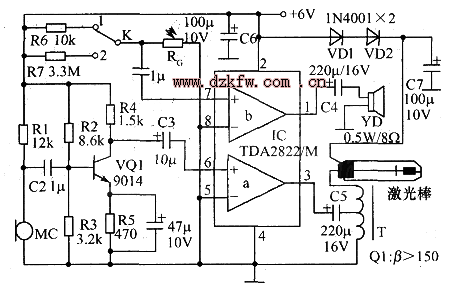 激光电话电路原理图如图所示。该电路以音频集成功放电路TDA2822为核心,分为发射和接收两个单元。在发射单元中,话筒MC将声波信号转化为电信号,经VQ1前置放大后送到IC-a功率放大,输出信号加在变压器T上,从而达到用音频信号调制激光的目的。在接收单元中,因发射端的音频信号调制的激光照射到光敏电阻器上,RG将光信号转化为电信号输入到IC-b中放大,直接推动扬声器发声。K为环境选择开关:置1时,接收器在高亮度环境中使用,如白天;置2时,接收器在低亮度环境中使用,如夜晚。