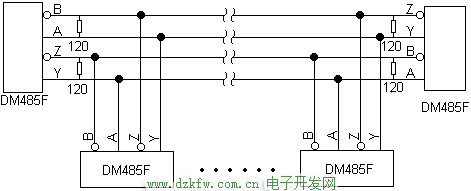 DM485的输出端最多可以连接256个RS485接口,其典型接法如图3(半双工)和图4(全双工)所示。在最远的两个终端上,输入和输出端之间各需接 上一个120欧姆的电阻。在RS485/RS422的接口连接时,甲接口的输出端接乙接口的输入端,双绞线的正极接正极,负极接负极;甲接口的输入端接乙 接口的输出端,双绞线的正极接正极,负极接负极。
