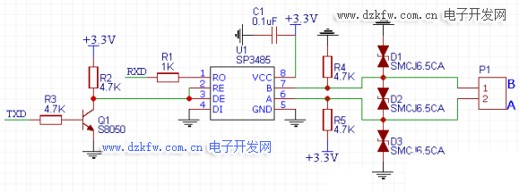 接收:默认没有数据时,在接收数据的过程中,TXD引脚是一直保持高电平的,三极管导通,RE低电平使能,485芯片处于接收状态,然后485芯片的RO引脚(也就是接RXD的引脚)就会反应AB传输过来的数据。