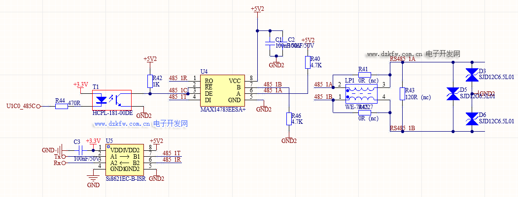 1 带隔离的基本485电路,芯片选用MAX14783。2 自动切换电路