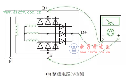 将数字式(万用表)置于二极管挡或机械式万用表电阻挡,如下图所示,红表笔接发电机“E”端,黑表笔接“B+”或“D+”,读数应小于1V。如果读数为0 或∞,说明整流器损坏;交换表笔,读数应为∞,否则也表明整流器损坏。