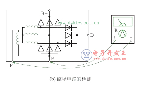 ① 在发动机熄火状态,接通点火开关,用直流试灯的一端接磁场(“F”)接线柱,另一端接外壳。如试灯亮,则说明发电机励磁电路良好;如试灯不亮,则说明调节器有问题。拆下电枢(“+”)接线柱上的线头后启动发动机,使其以稍高于怠速的转速运转,再用试灯的一端触外壳,另一端触“+”接线柱。灯不亮或为暗红光,则说明交流发电机内部有问题。