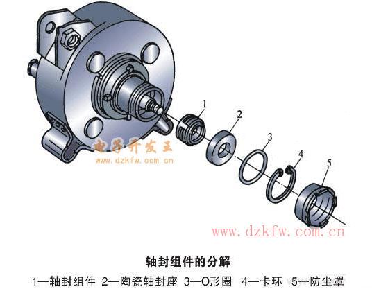 7)用卡环钳安装卡环,卡环的平面一侧与轴封座接触(注意:卡环不可装反,否则会使卡环脱落;不要敲击卡环,否则会损坏陶瓷轴封座)。