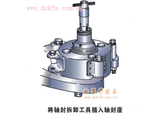 7)将轴封座拆卸工具插入轴封座中,出轴封座(见图)。