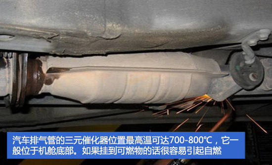 作为车上重要的配件,汽车排气管的三元催化器位置最高温可达700-800℃,它一般位于机舱底部。如果挂到外部可燃物的话很容易引起自燃(如稻草、塑料袋等)。