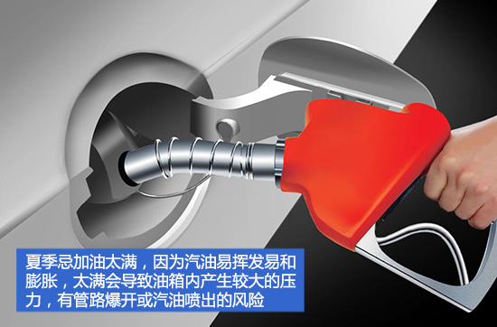 此外,夏季忌加油太满,因为汽油易挥发易和膨胀,夏季加油太满会导致油箱内产生较大的压力,有管路爆开或汽油喷出的风险。