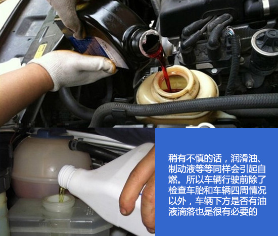 除了燃油以外,车辆一般还会有润滑油、制动液等等,如果稍有不慎的话,它们同样会引起自燃。所以车辆行驶前除了检查车胎和车辆四周情况以外,车辆下方是否有油液滴落,也是建议大家要检查的。
