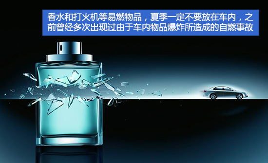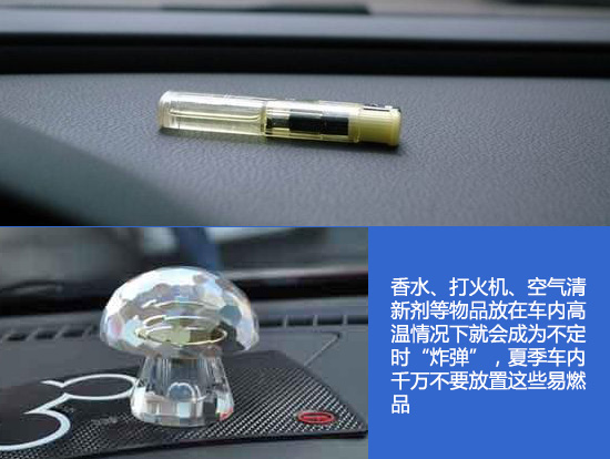 尤其是对于女性车主,她们经常会把香水、打火机、空气清新剂等物品放在车内,殊不知这些物品在高温下就会成为不定时“炸弹”。比如球形香水座在阳光的直射下会产生聚光作用,聚光部位可能产生高温而引燃内饰。所以夏天来临之际,我们千万不要把这些物品物品长期放在车内。