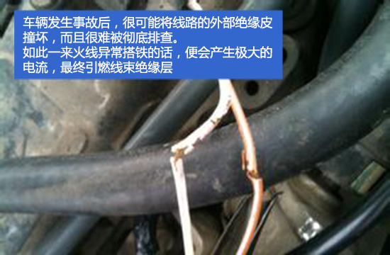 发生交通事故后车辆的外观件比较容易更换,但一些“暗伤”却很难彻底排除。比如车辆在撞击时,很可能将线路的外部绝缘皮撞坏。如此一来火线异常搭铁的话,便会产生极大的电流,最终引燃线束绝缘层。