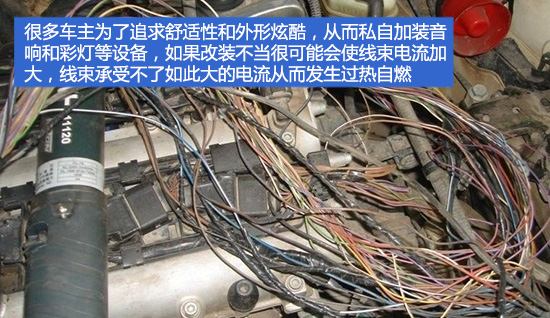 此外,很多车主为了追求舒适性和外形炫酷而私自加装音响和彩灯等设备,如果改装不当很可能会使线束电流加大,线束承受不了如此大的电流从而发生过热自燃。要知道私自加改线路,保险公司是不给予理赔的。