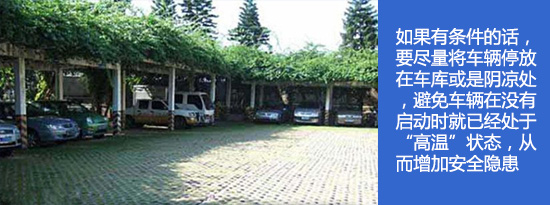 夏天气温很高,阳光照射下的车身温度高的吓人。如果有条件的话,我们要尽量将车辆停放在车库或是阴凉处,避免长时间直晒太阳。没有不允许的话,也可以采用遮阳帘等降温小物件,这样避免车辆在没有启动时就已经处于“高温”状态,从而降低安全隐患。
