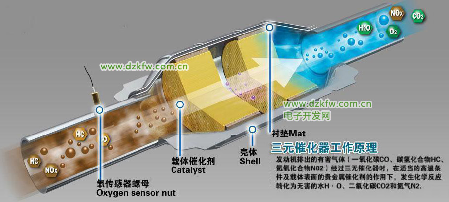 发动机通过排气管排气时,CO、HC、和NOx三种气体通过三元催化反应器中的净化剂时,增强了三种气体的活性,进行氧化----还原化学反应。