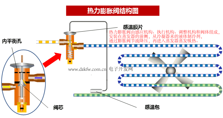热力膨胀阀安装在蒸发器入口,常称为膨胀阀,主要作用有两个: