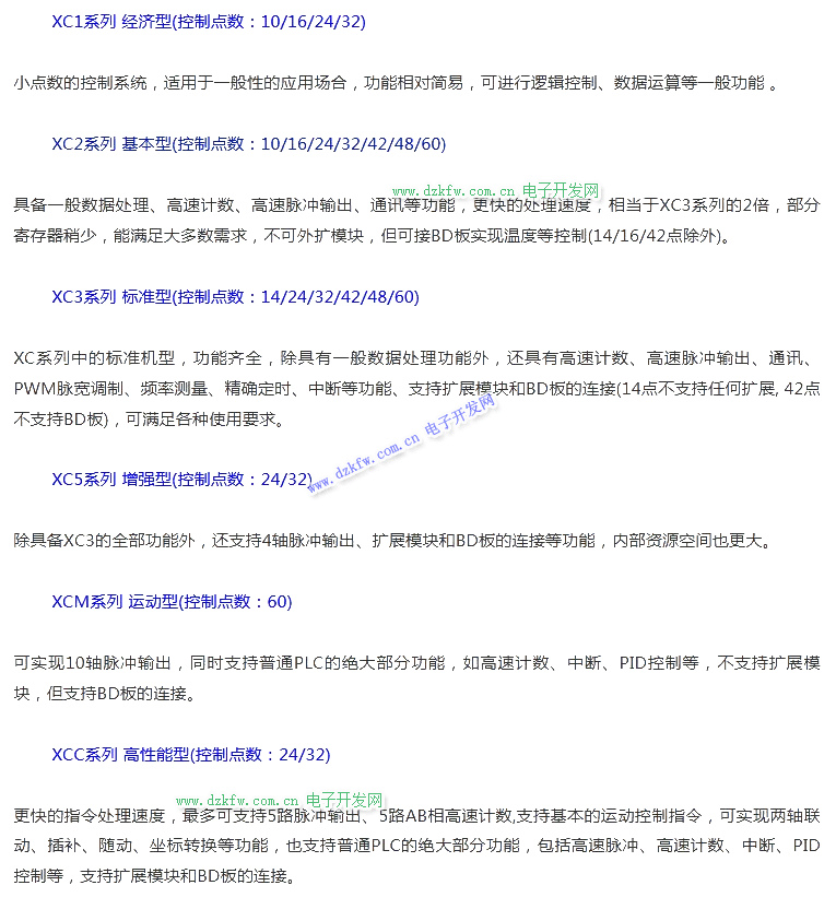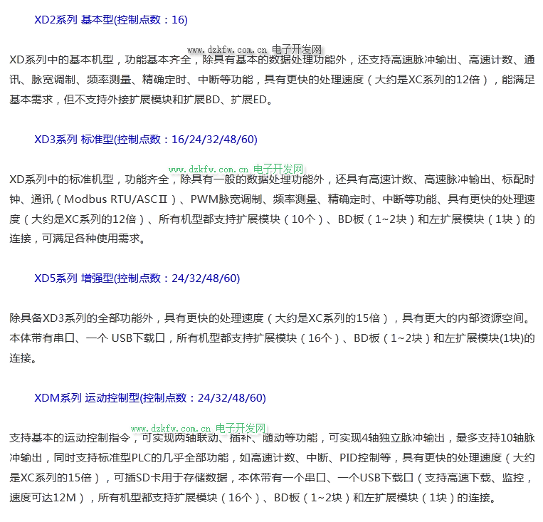 支持基本的运动控制指令,可实现两轴联动、插补、随动等功能,可实现4轴独立脉冲输出,最多支持10轴脉冲输出,同时支持标准型PLC的几乎全部功能,如高速计数、中断、PID控制等,具有更快的处理速度(大约是XC系列的15倍),可插SD卡用于存储数据,本体带有一个串口、一个USB下载口(支持高速下载、监控,速度可达12M),所有机型都支持扩展模块(16个)、BD板(1~2块)和左扩展模块(1块)的连接。