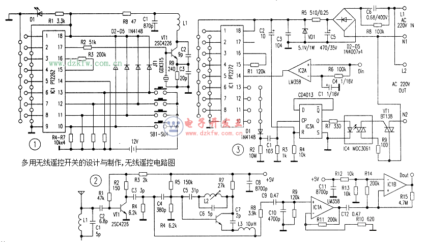 图2、图3分别为高频接收和译码控制电路。图2中天线接收到的信号经VT1高频放大之后进入VT2进行选频,选出与发射器载波频率相同的信号,进入IC1A放大.放大后的信号进入ICIB整形后由Dout输出至图3的Din,再经过IC2A的进一步滤波整形送入PT2272的14脚。 PT2272是与PT2262配套使用的译码集成电路,它也有8位3态地址引脚,只有与PT2262的地址引脚设置相同时,才能正确译出数据信号,在PT2272的对应输出端输出高电平。D1、R2、R3、C1组成消除按键抖动的电路,以保证遥控操作的可靠性。D1的正端可以接在PT2272的⑩脚至13脚之任一处,它们分别与发射器的4个按键对应。 C2和R4完成对CD4013的预置,使初次加电时CD4013的输出端为低电平,即受控电器处于断电状态。IC4为带过零触发功能的光电耦合器,当CD4013输出高电平时,光耦工作,同时触发双向可控硅导通,在输出端输出220V电压。采用可控硅作为开关控制可以消除采用继电器产生的噪音,同时整个电路的可靠性也得以提高。接收部分电路的供电采用阻容降压方式,实现了整个电路的小型化。