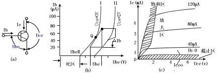 三极管的特性曲线 1、输入特性 图2 (b)是三极管的输入特性曲线,它表示Ib随Ube的变化关系,其特点是:1)当Uce在0-2伏范围内,曲线位置和形状与Uce有关,但当Uce高于2伏后,曲线Uce基本无关通常输入特性由两条曲线(Ⅰ和Ⅱ)表示即可。 2)当Ube<UbeR时,Ib≈O称(0~UbeR)的区段为“死区”当Ube>UbeR时,Ib随Ube增加而增加,放大时,三极管工作在较直线的区段。 3)三极管输入电阻,定义为: rbe=(△Ube/△Ib)Q点,其估算公式为: rbe=rb+(β+1)(26毫伏/Ie毫伏) rb为三极管的基区电阻,对低频小功率管,rb约为300欧。 2、输出特性 输出特性表示Ic随Uce的变化关系(以Ib为参数)从图9(C)所示的输出特性可见,它分为三个区域:截止区、放大区和饱和区。 截止区当Ube<0时,则Ib≈0,发射区没有电子注入基区,但由于分子的热运动,集电集仍有小量电流通过,即Ic=Iceo称为穿透电流,常温时Iceo约为几微安,锗管约为几十微安至几百微安,它与集电极反向电流Icbo的关系是: Icbo=(1+β)Icbo 常温时硅管的Icbo小于1微安,锗管的Icbo约为10微安,对于锗管,温度每升高12℃,Icbo数值增加一倍,而对于硅管温度每升高8℃, Icbo数值增大一倍,虽然硅管的Icbo随温度变化更剧烈,但由于锗管的Icbo值本身比硅管大,所以锗管仍然受温度影响较严重的管,放大区,当晶体三极管发射结处于正偏而集电结于反偏工作时,Ic随Ib近似作线性变化,放大区是三极管工作在放大状态的区域。 饱和区当发射结和集电结均处于正偏状态时,Ic基本上不随Ib而变化,失去了放大功能。根据三极管发射结和集电结偏置情况,可能判别其工作状态。