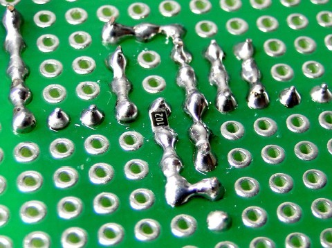 贴片电阻可直接焊接在洞洞板的两个焊盘之间