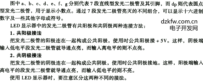 LED是发光二极管的缩写。数码显示器是由7段发光二极管构成的,应用非常普遍。除此之外,还有液晶显示器(LCD)、真空荧光显示器(VFD)、等离子显示器(PDP),本章只介绍数码显示器和液晶显示器。