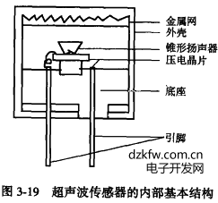 超声波传感器的内部基本结构如图 3—19所示,由金属网、外壳、锥形扬声器、压电晶片、底座、引脚等部分组成。