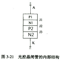 光控晶闸管是一种由光照强度控制导通或截止状态的光触发晶闸管。通常的光电控制多用弱电控制,而光控晶闸管则是一种强电控制器件。光控晶闸管的结构如图 3—21所示,光控晶闸管是使用硅材料制成的与普通晶闸管一样的 P—N—P—N结构,但其导通状态与光照波长有关。