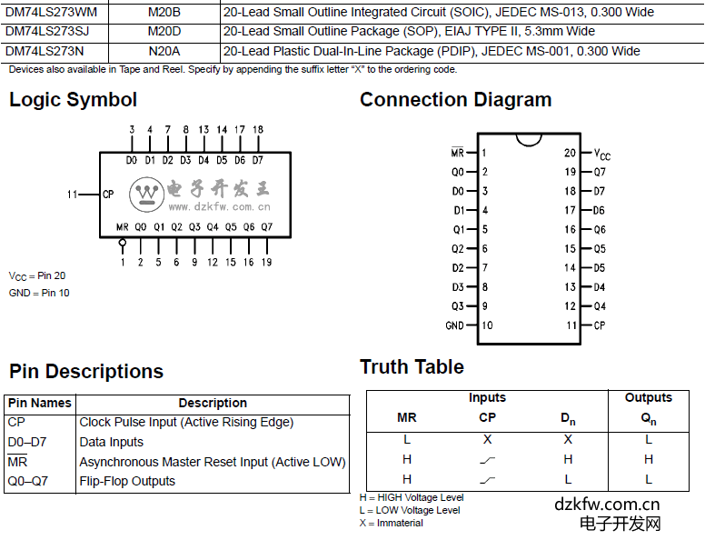 1D~8D为数据输入,在11脚(CLK)从低电平跳变到高电平时(即上跳沿),1D~8D被保存到74273寄存器中,同时1Q~8Q输出对应1D~8D的电平。