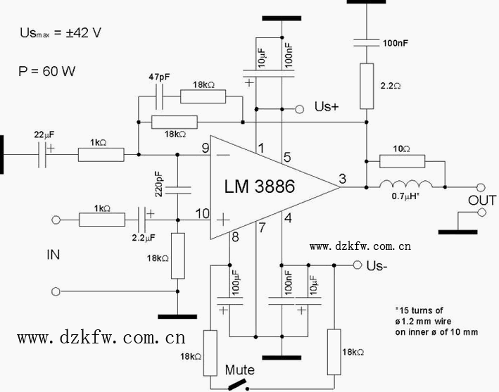 LM3886TF是美国NS公司推出的新型的大功率音频放大集成电路,其后面的TF为全绝缘封装,和 LM1875T相比,它的功率较大,在额定工作电压下最大可达68W的连续不失真平均功率,同样具有比较完善的过压过流过热保护功能, 最可贵的是它具有自动抗开关机时的电流冲击的功能,使扬声器能够安全的工作。 LM3886优异的性能,使得它在近几年音响制作中广泛的应用,许多成品功放机中就有直接的应用它担任后级功放或者用它作为重低音放大电路。采用了美国NS公司(国家半导体公司)推出的新型高保真音响功放集成电路LM3886TF作功率放大,用运放NE5532或AD827作前置线性放大和音调放大。其特点有:输出功率大(连续输出功率68W)、失真度小(总失真加噪声<0.03%)、保护功能(包括过压保护、过热保护、电流限制、温度限制、开关电源时的扬声器冲击保护、静噪功能)齐全,外围元件少,制作调试容易,工作稳定可靠。由于用它制作功率放大电路具有简易,适用的特点,特别适合于烧友以及电子爱好者的制作。