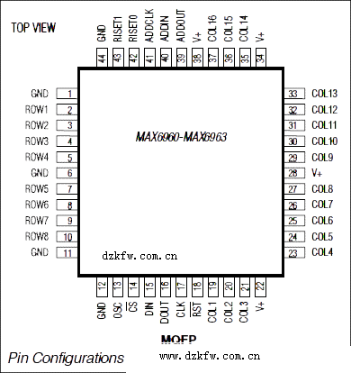 MAX6960–MAX6963是紧凑型阴极阵列显示驱动器,通过一个高速4线串行接口与微处理器连接,实现8 x 8点阵红色、绿色和黄色(R,G,Y) LED显示。