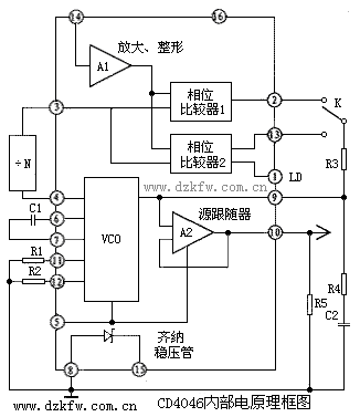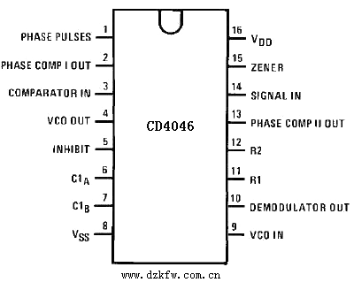 下图是CD4046的引脚排列,采用16脚双列直插式,各管脚功能: