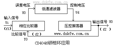 下图用CD4046与BCD加法计数器CD4518构成的100倍频电路。刚开机时,f2可能不等于f1,假定f2<f1,此时相位比较器Ⅱ输UΨ为高电平,经滤波后Ud逐渐升高使VCO输出频率f2迅速上升,f2增大值至 f2=f1,如果此时 Ui滞后 U0,则相位比较器Ⅱ输出UΨ为低电平。UΨ经滤波后得到的Ud信号开始下降,这就迫使VCO对f2进行微调,最后达到f2/N=f1,并且f2与f1的相位差Δφ=0°。,进入锁定状态。如果此后f1又发生变化,锁相环能再次捕获f1,使f2与f1相位锁定。