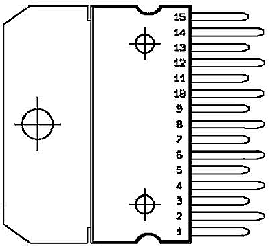 :①脚为待机端;②脚为反相输入端;③脚为正相输入端;④脚接地;⑤、⑾、⑿脚为空脚;⑥脚为自举端;⑦脚为+Vs(信号处理部分); ⑧脚为-Vs(信号处理部分);⑨脚为待机脚;⑩脚为静音脚;⒀脚为+Vs(末级);⒁脚为输出端;⒂脚为-Vs(末级)。