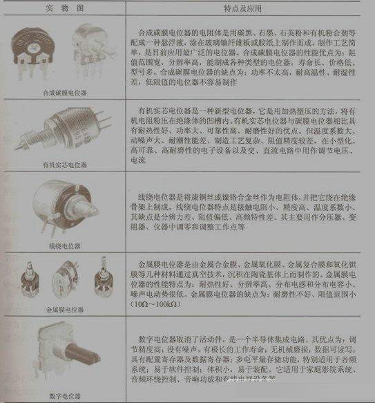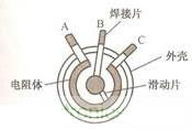 电位器由外壳、滑动轴、电阻体和三个引出端组成,如图所示。电位器的种类很多,按调节方式可分为旋转式(或转柄式)和直滑式电位器;按联数可分为单联式和多联式电位器;按有无开关分为无开关和有开关两种;按阻值输出函数特性可分为直线式电位器、指数式电位器和对数式电位器三种。如实芯电位器、片式电位器、碳膜电位器、玻璃釉电位器、精密导电塑料电位器和其他电位器。
