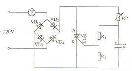 图4所示是一个简单实用的调光台灯电路。调节RP的阻值,可改变电容C充电达到UG值得时间,即调整晶闸管的导通角,使晶闸管早一点或迟一点触发导通,从而调节晶闸管的输出电压,使灯两端电压能在0~220V间变化。电压高,灯发光亮;电压低,灯发光暗。
