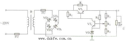 直流稳压电源电路如图所示。一般R4可选小功率碳膜电位器、RP选大功率的线绕滑动式电位器。调节R4的阻值可改变输出电压U的高低,调节RP可测试电源的带负载能力。