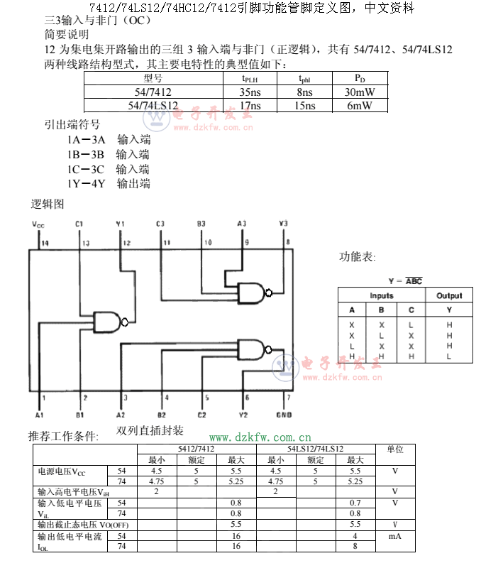74ls12 3输入三与非门 (oc) , 7412 三输入与门电路