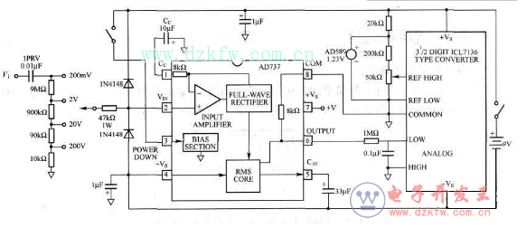 本电路中,输入的是 0~200.0mV 的交流信号,输出的是 0~200.0mV 的直流信号,从信号幅度来看,并不要求电路进行任何放大,但是,正是电路本身具有的放大作用,才保证了其几乎没有损失地进行 AC - DC 的信号转换。因此,这里使用的是低功耗的高阻输入运算放大器,其不灵敏区仅仅只有 2mV 左右,在普通数字万用表中大量使用,电路大同小异。