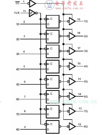时钟线上的施密特触发缓冲输入将简化系统设计,因为输入滞后作用使交流和直流抗扰度一般提高400mV。缓冲输出的控制输入将使八个输出处于正常状态(高电平或低电平)或处于高阻状态。在高阻态下,输出既不能有效地给总线加负载,也不能有效地驱动总线。