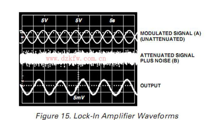 锁定放大器就是一个基本的同步解调器后跟随一个低通滤波器。锁定放大器的应用的一个非常重要的测量参数就是解调器的动态范围,如图14所示的原理图,表示了用于锁定放大器时AD630的动态范围,图15为示波器照片,显示了AD630很大的动态范围。此图演示了一个400Hz的调制信号从大小近似自身100000倍的噪音信号种恢复出来。