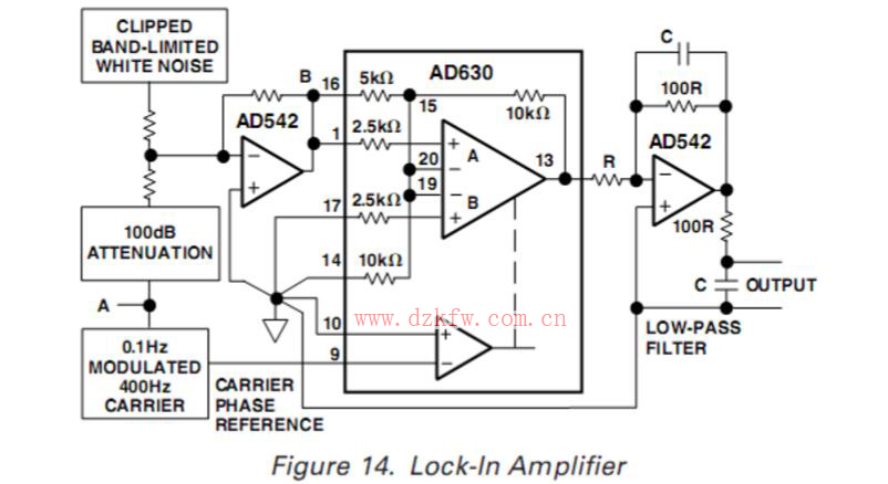 上述这个混合的信号和干扰噪音类似于要求进行检测的锁定放大的信号。AD630精确的输入性能提供了大于100dB的信号范围,并且其动态响应允许其用于载波频率比实例中的大于两个或以上的数量级。一个更复杂的低通输出滤波器,将有助于抵抗更宽的带宽干扰。