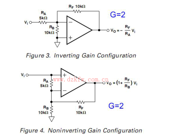 当Rf/Ra=1+Rf/Rb时,这两个闭环增益大小相等,这是由于使Ra等于RfRb/(Rf+Rb),Rf和Rb的并联等效电阻。