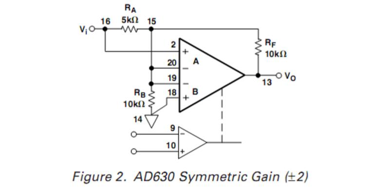 5KkΩ和两个10kΩ电阻可以使得AD630的增益为2。通过并联10kΩ的电阻使得Rf等于5kΩ,减去Rb,电路被编程为±1的增益(如9a所示)。这些和其它的,使用芯片上的电阻的配置表述了一个2.5kΩ的源阻抗的反相输入端。更完整的AD630框图表示了在同相输入端2.5kΩ电阻有效,这样能够方便减小由于输入偏置电流导致的误差。
