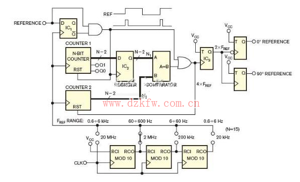 图2描绘了一条全数字电路,你可在小型CPLD中实施该电路,来产生图1中的0和90?基准信号。1号计数器以数字时钟脉冲的数量N的形式来测量基准信号时间,其中的基准时间可能不同于50%。在基准信号的每个正前沿,该计数器在N1=1处收到一条预设命令。D型双稳态多谐振荡器IC1产生这类脉冲。