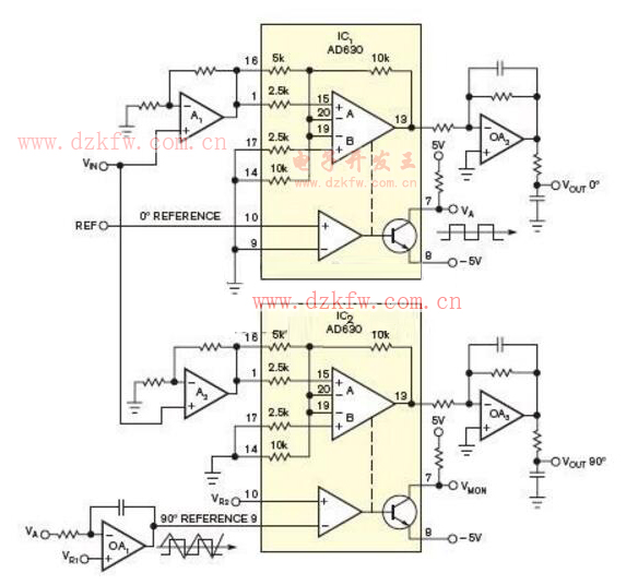 图1:OA1把双极VA信号积分,并创建三角波。VR1和VR2获得关于VA的90。相移基准电压。