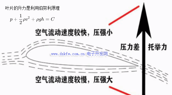 可以看到螺旋桨的桨面并不是平的,旋转时桨面上下的空气流速不一直,会产生向上的推力。